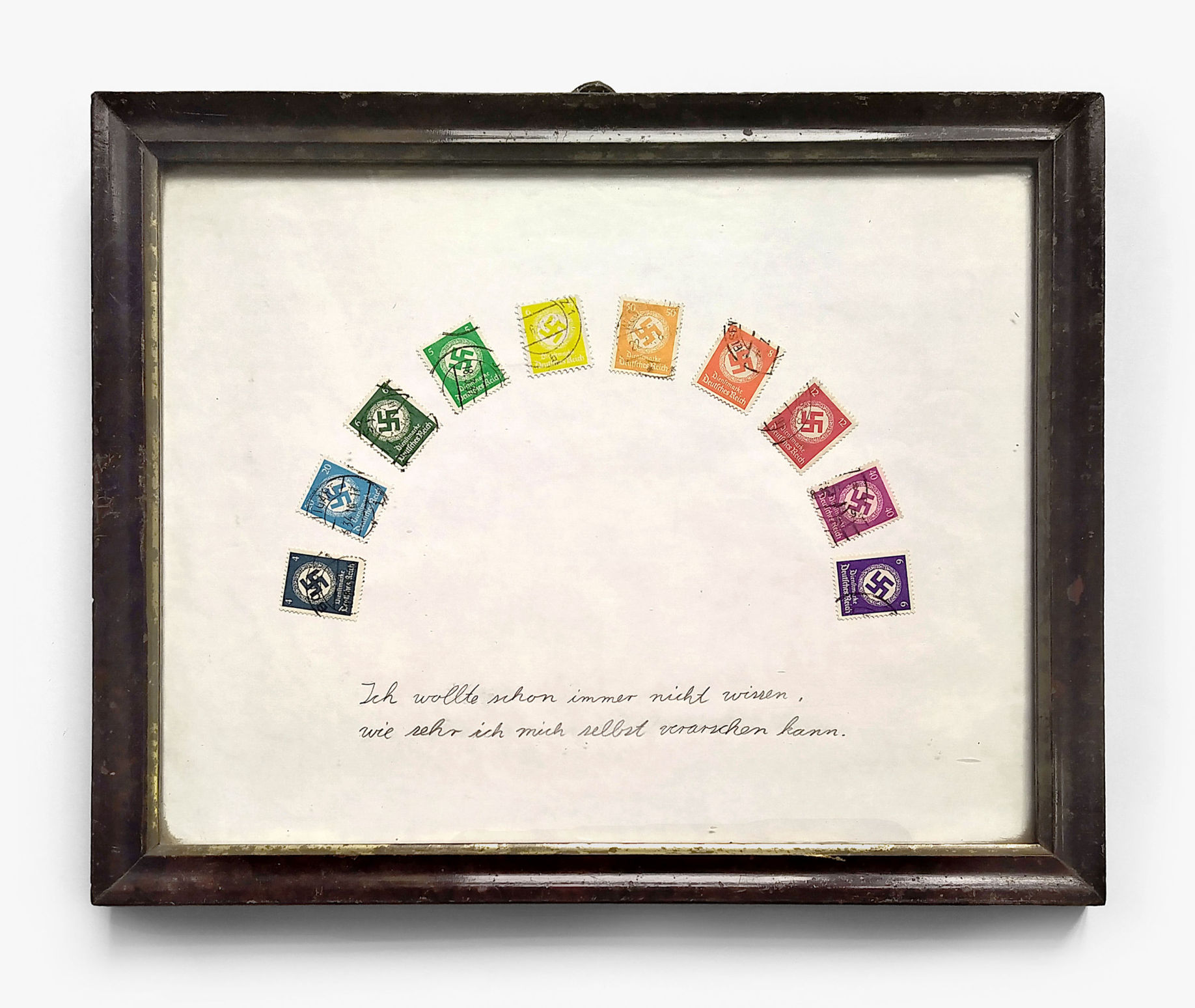 Thomas Behling, "Ich wollte schon immer nicht wissen, wie sehr ich mich selbst verarschen kann." 2021, Eine falsche und neun echte Hakenkreuzbriefmarken, Papier, Bleistift, Glas, Rahmen, 26 x 32 cm