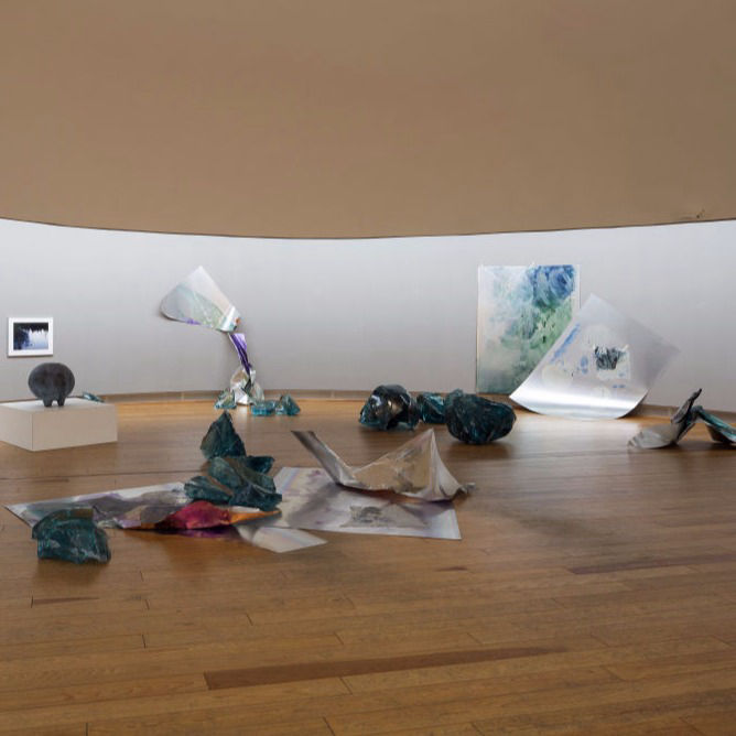 Im Rahmen der 2019 neu aufgelegten Ausstellungsreihe »Worpsweder Rotunde« lädt die Große Kunstschau 2020 Myriam Holme ein, für ein Jahr eine raumbezogene Installation zu entwickeln. Holme steht für eine der aufregendsten Positionen in der aktuellen Malerei. Sie verlässt nicht nur die klassischen Malmaterialien, indem sie mit Beizen, Blattgold und anderen alchimistisch anmutenden Farbmaterialien arbeitet, sie verlässt auch das klassische Trägermaterial und malt häufig nicht auf Leinwand, sondern auf Aluminiumplatten. Und auch die tradierte Grenze eines Rahmens lässt sie weit hinter sich, greift mit geknickten, geknautschten Platten, mit Folien oder mit Glasblöcken radikal in den jeweiligen Raum ein. Ihre konsequent gegenstandsfreie Malerei wird so zu einem physischen und sinnlichen Totalereignis. Holmes geradezu barock-überschwängliche, zugleich aber auch zarte Geste trifft auf die expressive Dynamik der Hoetgerschen Bauskulptur.