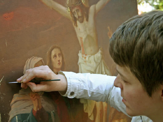 Sonja Toeppe gibt einen Einblick in ihre Tätigkeitsfelder. Anhand von Bildmaterial beschreibt sie, wodurch Schäden an Kunstwerken entstehen, wie sie behoben werden können und wie zukünftig weitere Schäden vermieden werden können.